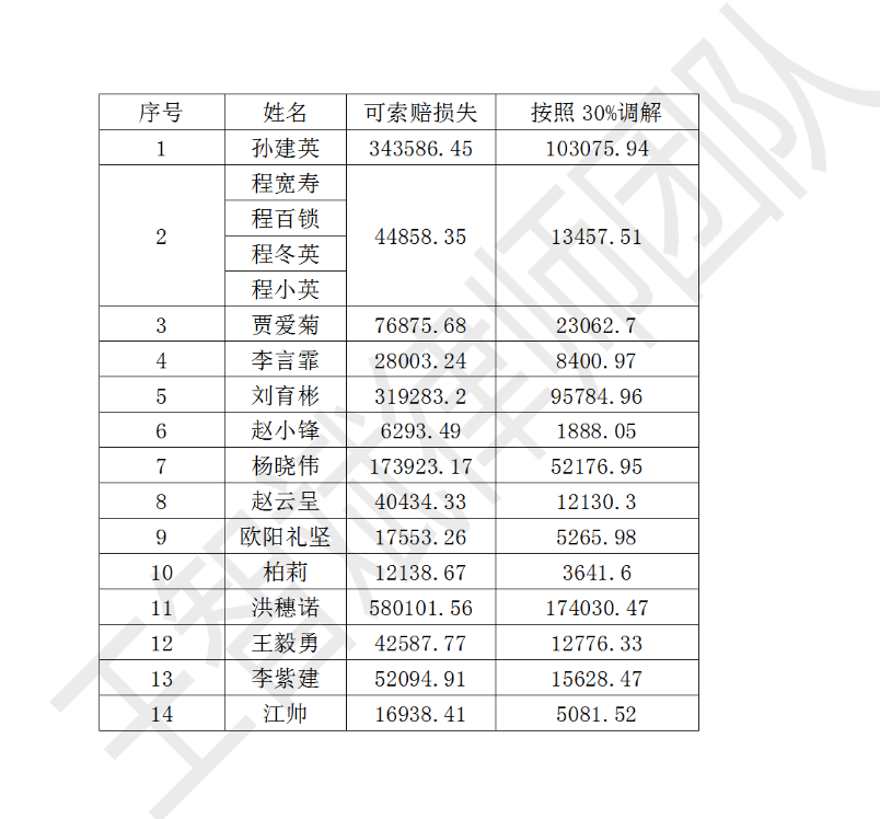 1. 赔偿款项为各方确认无误数据的30%,每人的具体金额详见附表一