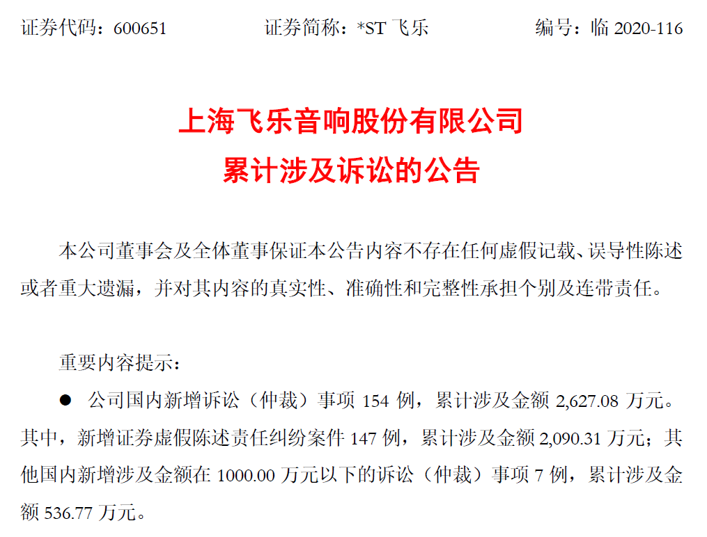 根据飞乐音响8月4日公告显示,飞乐音响仅自今年6月3日至今,公司国内新增诉讼(仲裁)事项154例,累计涉及金额2,627.08万元。其中,新增证券虚假陈述责任纠纷案件147例,累计涉及金额2,090.31万元,其他国内新增涉及金额在1000.00万元以下的诉讼(仲裁)事项7例,累计涉及金额536.77万元。