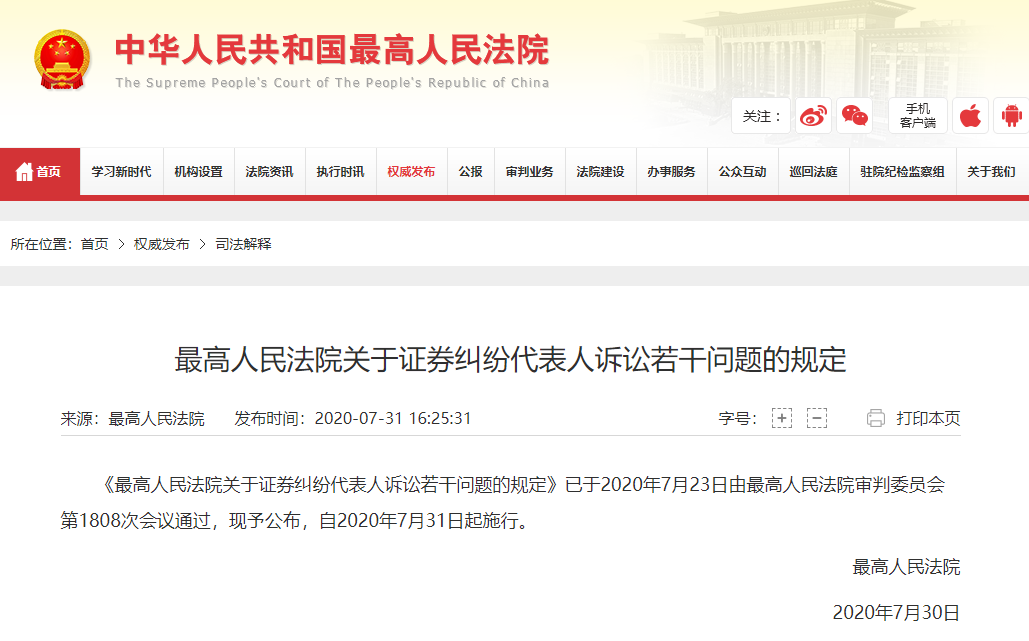 为进一步完善证券集体诉讼制度,便利投资者提起和参加诉讼,降低投资者维权成本,保护投资者合法权益,有效惩治资本市场违法违规行为,维护资本市场健康稳定发展,今年7月31日,最高人民法院发布《最高人民法院关于证券纠纷代表人诉讼若干问题的规定》。